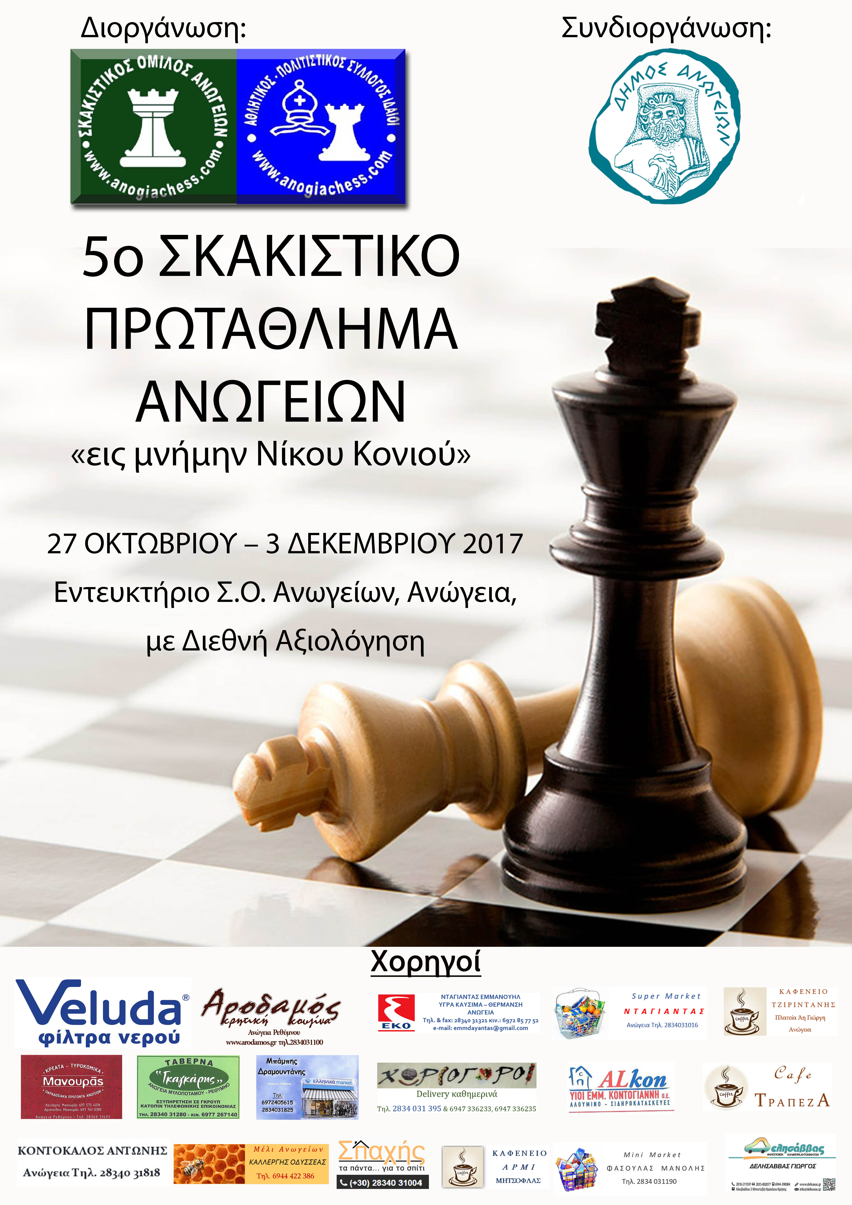 Ξεκινάει την Παρασκευή 27 Οκτωβρίου το 5ο Σκακιστικό Πρωτάθλημα Ανωγείων στο οποίο θα πάρουν μέρος σκακιστές και σκακίστριες από τα δύο σωματεία των Ανωγείων, τον Σκακιστικό Όμιλο Ανωγείων και τον Αθλητικό-Πολιτιστικό Σύλλογο «Ιδαίοι». Έπειτα από κοινή, ομόφωνη απόφαση των δύο συλλόγων, το πρωτάθλημα θα είναι αφιερωμένο στην μνήμη του Νίκου Κονιού, ενός από τους πρωτεργάτες των σκακιστικών πραγμάτων στα Ανώγεια, ο οποίος μας άφησε πρόσφατα.